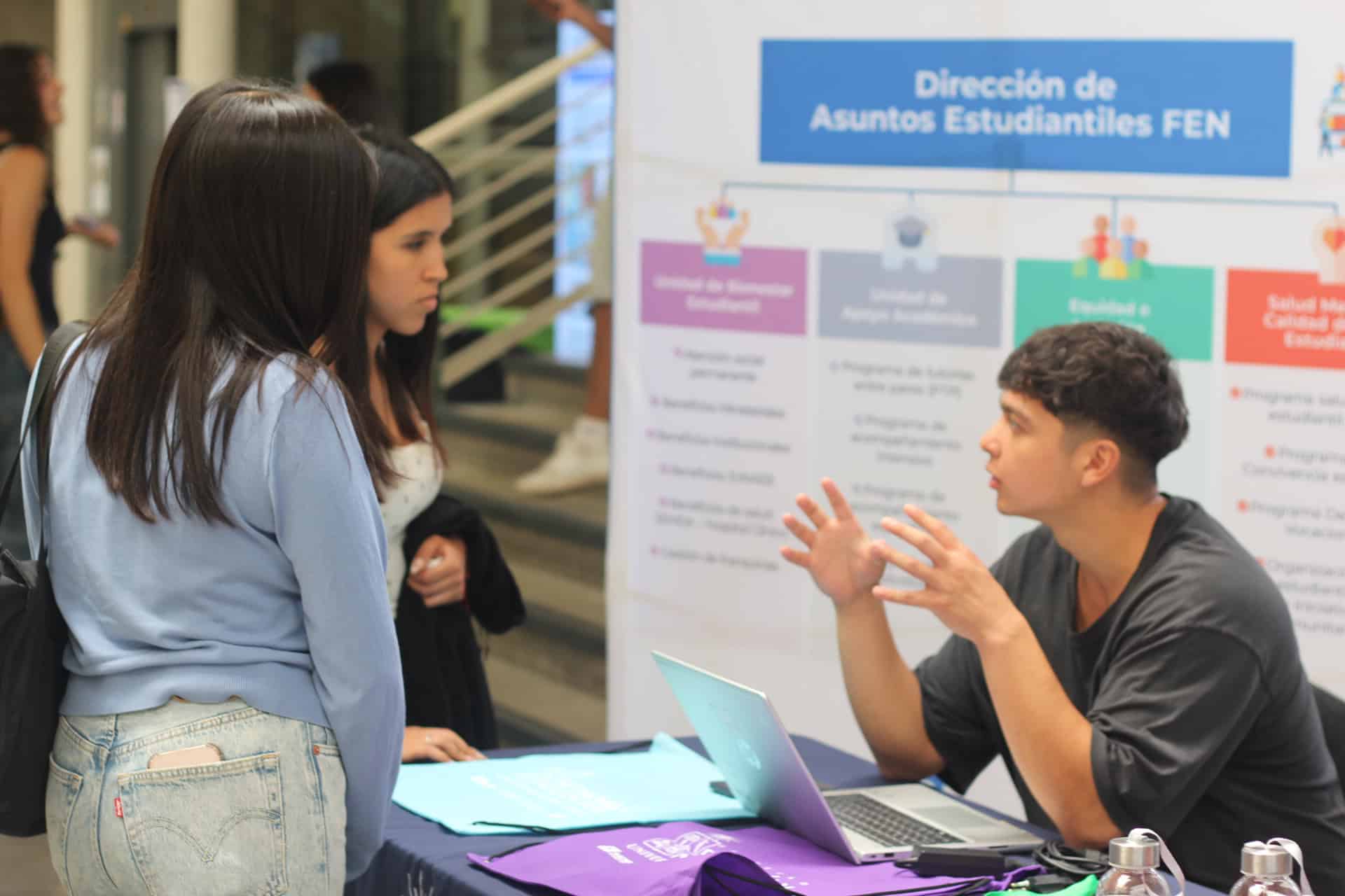 María Pilar Calderón, Directora de Asuntos Estudiantiles de las Escuelas de Pregrado de la FEN, destacó la relevancia de este despliegue señalando que: “La DAE es la unidad encargada de brindar los apoyos, beneficios y dispositivos de soporte a las y los estudiantes en temática como bienestar estudiantil, apoyo académico, adecuaciones y ajustes y apoyo académico a las neurodivergencias y también lo que tiene que ver con las políticas de salud mental y convivencia estudiantil”.
